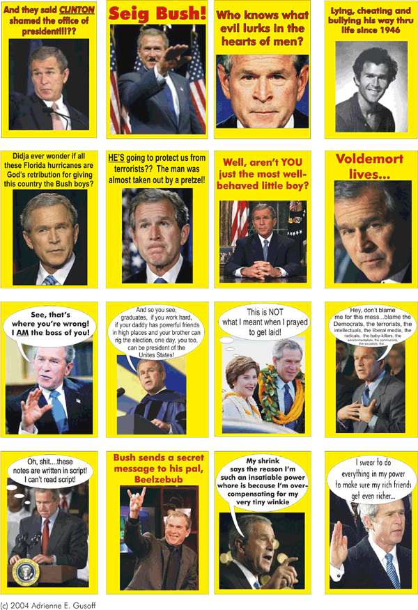 These sheets of Bush stickers are all product of my demented mind The full page images you see here are Low Res. They were designed to be printed on 8 1/2 x 11 sticky-back paper Print out a bunch of copies and stick 'em on correspondance, bills, notebooks, More coming soon. Please check back often. Have a favorite image from this page